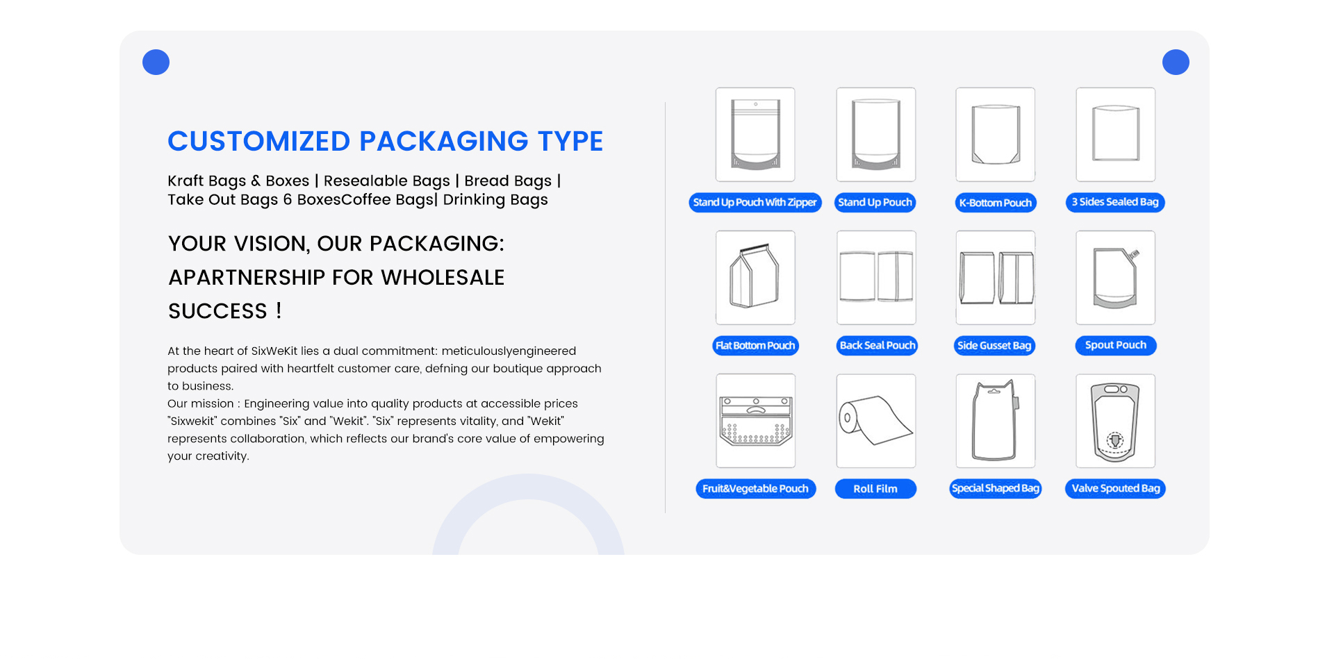 Food packaaing baas are divided into kraft paper bags, coffee bags and hot salepackaging BqasAll of these can be used to package different kinds of food.This material has reached food grade.Size,thickness and style can be customized.